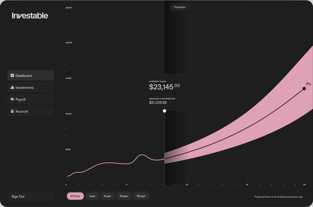 For the first time ever, our proprietary tech allows anyone with a payroll account to access the stock market directly. This way, Investable customers can ‘set it and forget it,’ growing their money reliably before the world gets its grubby little hands all over it.